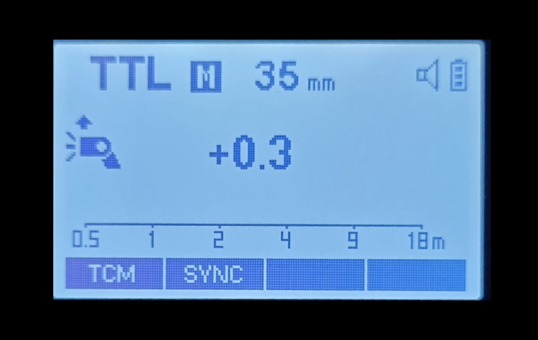 Drücke die MODE-Taste auf der Rückseite, bis im Display „TTL“ erscheint. Der Blitz arbeitet nun automatisch mit der Kamera zusammen.