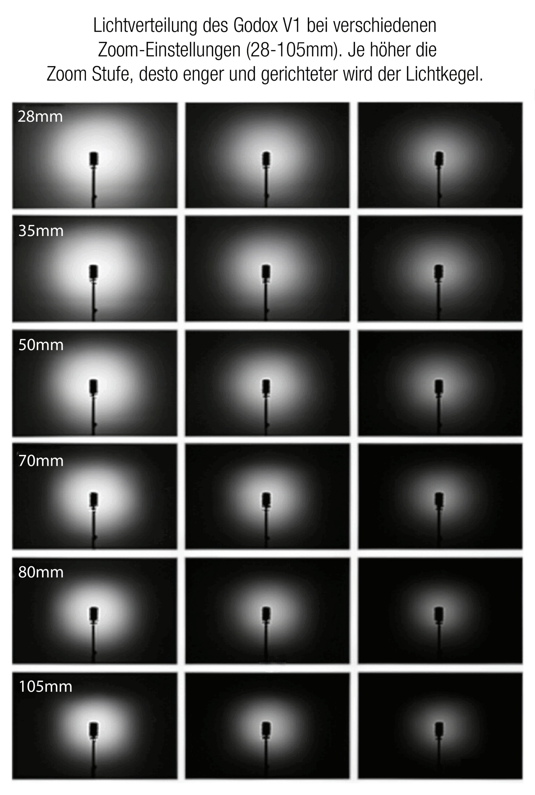Der Zoom am Godox V1 bestimmt, wie breit oder eng das Blitzlicht auf das Motiv fällt. Im automatischen Modus passt sich der Blitz zwischen 28 mm und 105 mm automatisch an die aktuelle Brennweite deines Objektivs an.